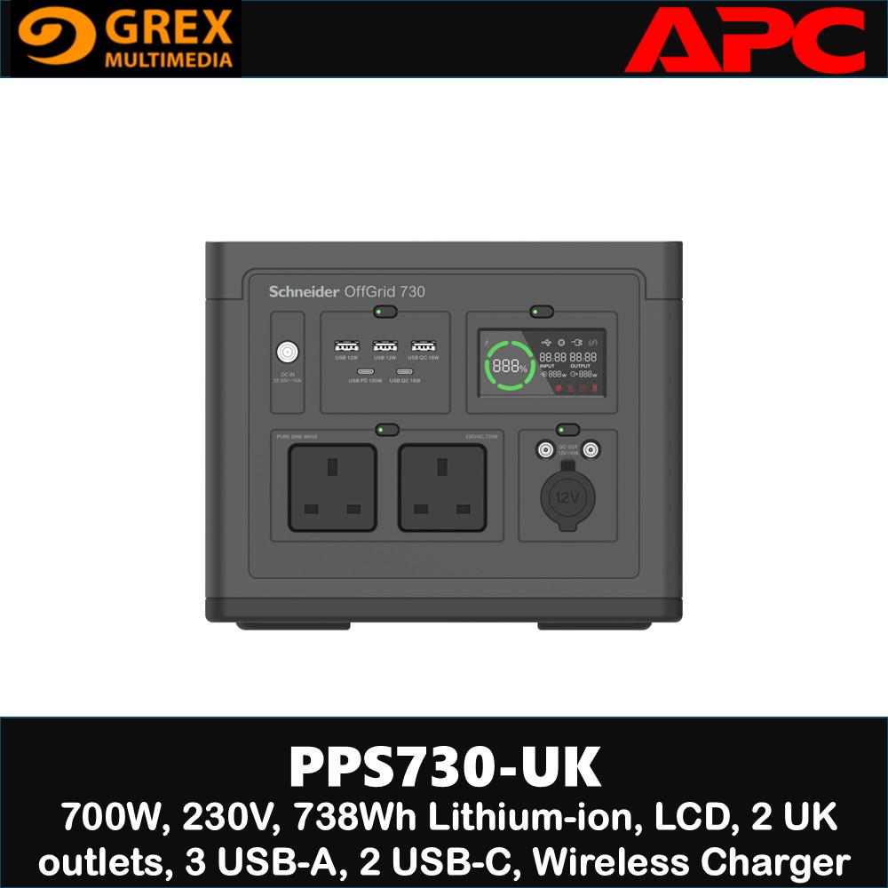 APC Schneider OffGrid Portable Power Station 730, 700W, 230V, 738Wh Lithium-ion, LCD, 2 BS1363 UK outlets, Sinewave, 3 USB-A, 2 USB-C, Wireless Charger (PPS730-UK)